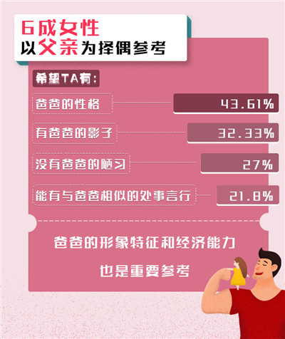 除在脱单心理上产生的影响之外,父母还会对子女产生哪些方面的影响呢?数据显示,近五成单身男女表示婚恋观受到父母影响。以单身女性为例,有六成女性在择偶时会将自己的父亲作为参考,43.61%的女性希望未来的另一半具有自己父亲的性格,32.33%希望他具有父亲的影子,27%的女性希望另一半没有父亲的陋习,21.8%的女性希望另一半能有与父亲相似的处事言行。除性格、处事言行外,父亲的形象特征和经济能力同样也是女性择偶的标准来源。