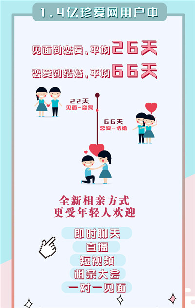 深入分析发现,在线下红娘一对一相亲过程中,见面到恋爱平均时间为26天,恋爱到结婚平均时间为66天,百天左右即可完成婚姻大事。
