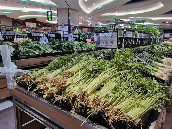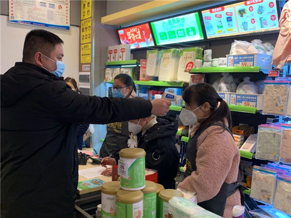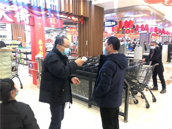 场内世纪华联超市进入口设测温登记点,确保市民安全采购,且生活日需货品不断供、不涨价。