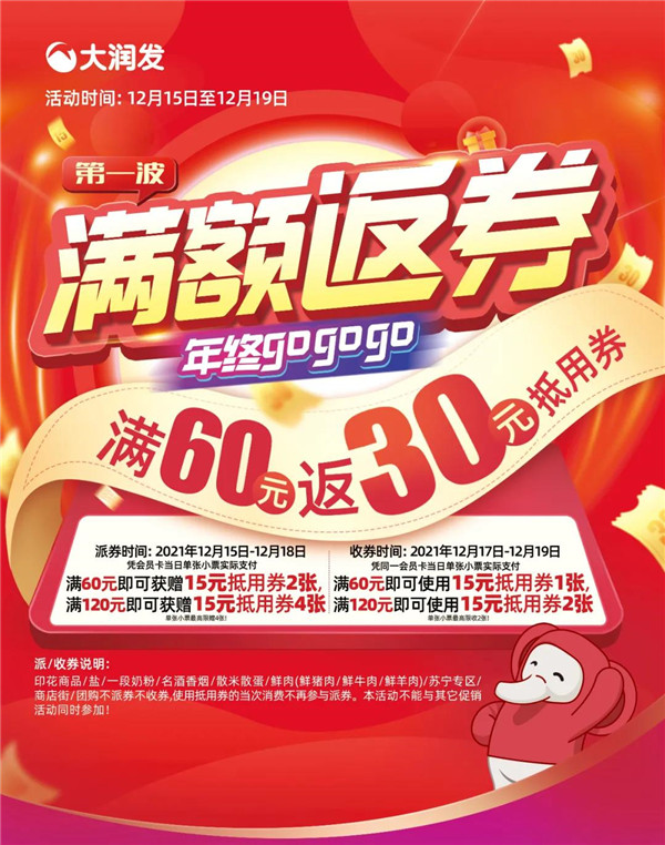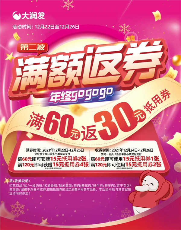 大润发|年终满额返券 购物满60元返30元抵用券