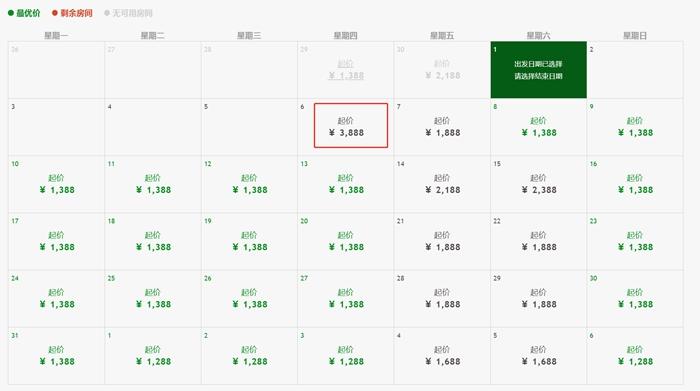 某度假酒店平时售价1000多元的套餐,国庆期间10月6日售价3888元。该酒店官网截图