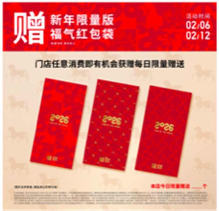 即日起,消费者可前往优衣库门店免费领取2026新年海报,内含创意互动内容,数量有限。2月6日至12日期间,门店任意消费有机会获赠每日限量的常沙娜合作款福气红包。优衣库新会员注册可领取300减20优惠券,有效期7天。