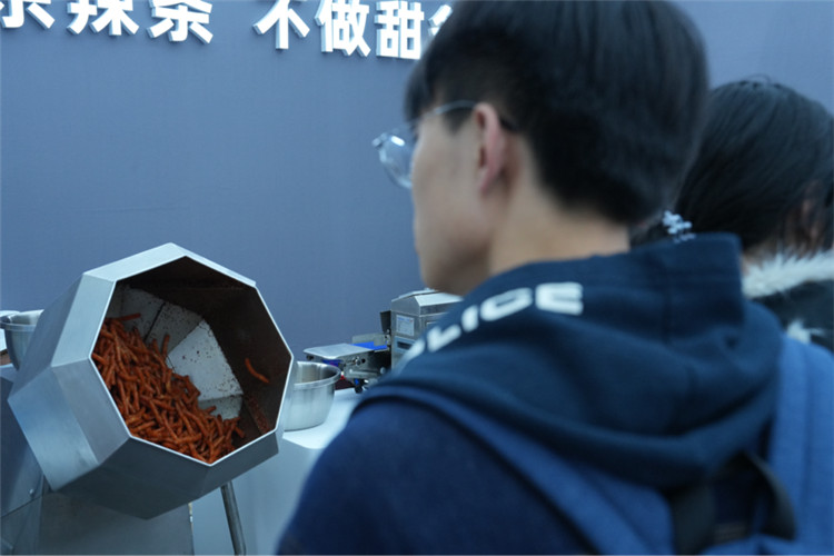 展馆外立面以辣条食模搭配灯光打造特色造型,内部规划辣条起源、原料工艺、正宗麻辣体验三大核心区域,以集章打卡串联参观流程。馆内集中展示辣条生产核心原料,陈列打粉机、膨化机等迷你生产设备,还通过实拍十万级GMP洁净车间生产画面,直观呈现五重检验环节,让市民近距离了解辣条产业的品质把控体系。“原来辣条的生产环节这么严格,还能现场体验制作过程,出门带狗逛馆也有地方安置,能安心进去参观,体验特别周到!”前来参观的市民陈女士说道。