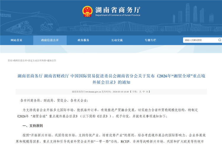 红网时刻新闻4月27日讯(记者 杨淑华)近日,2026泰国农业博览会正式纳入《2026年“湘贸全球”重点境外展会目录》,湖南省内企业赴泰国实地参展,可享受省级专项补贴支持,单家企业年度累计补贴最高可达100万元,切实降低企业出海参展成本,助力开拓东盟外贸市场。