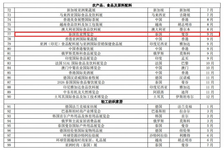 本次纳入重点目录的泰国农业博览会,是东盟地区规模较大、专业性较强的农业行业展会,覆盖农产品产销、农业装备、农业技术、冷链物流等多个领域,是湖南农业及相关产业企业对接东盟市场、拓展外贸业务的重要平台。