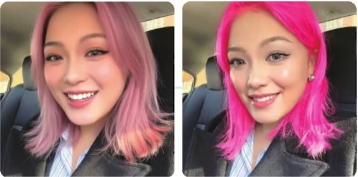 记者在LMArena平台上传了一张自己的照片,并下达指令,将发色变粉色,表情变为开心的露齿微笑。(左边为原图,右边为NanoBanana生成的图片)。