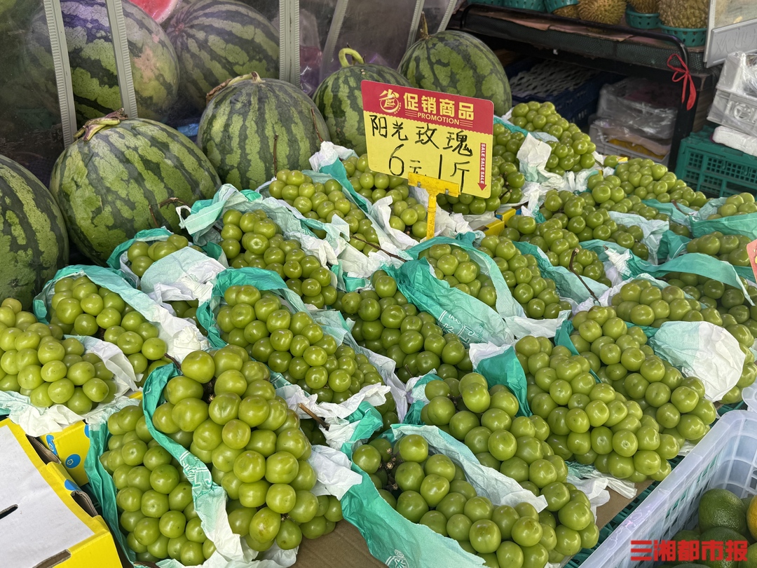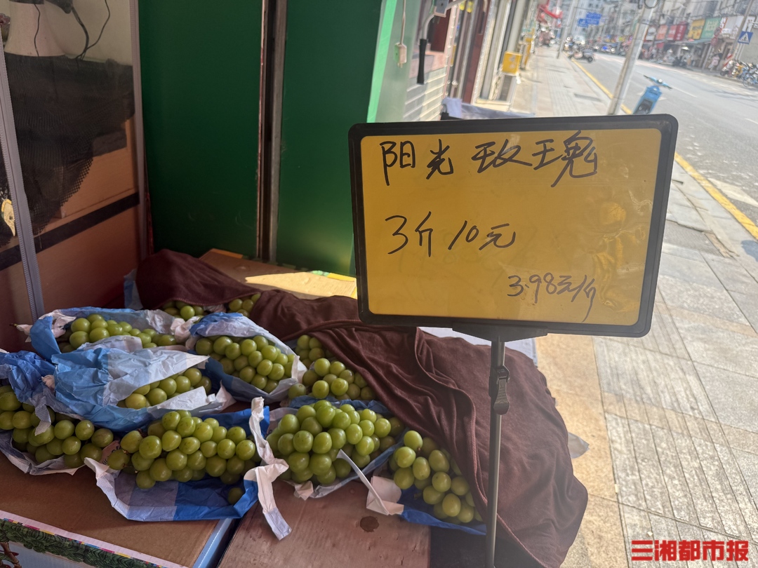 在开福区果心缘兴汉门店,阳光玫瑰被放在进门处“C位”,旁边10元1.5公斤的价格标签十分引人注目。“现在阳光玫瑰真是地板价了,记得它以前的价格那叫一个贵,100元只能买一小串,现在100元能买快一箱了。”长沙市民刘女士面对如今阳光玫瑰降价感慨道。一旁的果心缘水果店店主表示,门店的阳光玫瑰有7.96/公斤和19.8元/公斤两个价位,“前者是门店搞活动的本地阳光玫瑰,因此价格较便宜。两种价格不同的阳光玫瑰的口感还是相差较大,低价阳光玫瑰口感偏硬、带点酸。”