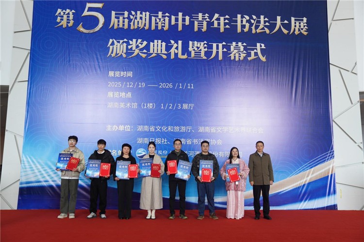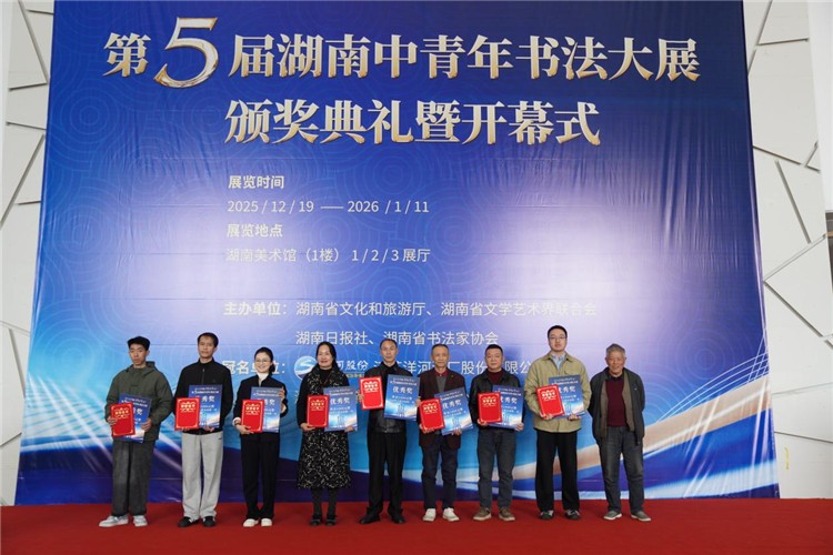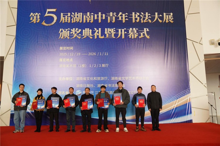 红网时刻新闻12月19日讯(记者 向婉)12月19日,“云起新湖南 墨舞大洋河”第五届湖南中青年书法大展开幕式暨颁奖典礼在湖南美术馆举行。现场,书法爱好者、文化艺术界人士齐聚,共同开启这场湖湘书法盛宴。展览集中呈现202件形式多样、内容丰富的书法作品,为观众打造了一场精彩纷呈的艺术体验。“优秀奖”作者现场接受表彰,此届展览展期至2026年1月11日,免费向市民开放。
