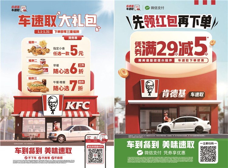 此外,肯德基车速取新年活动也即将上线:1月1日至1月31日,下单享三重福利,包括指定小食5元、早餐6折、午晚餐7折四件。微信支付用户还可领29元减5元券,在小程序下单使用。活动期内每日可领,车到餐到,方便快捷。